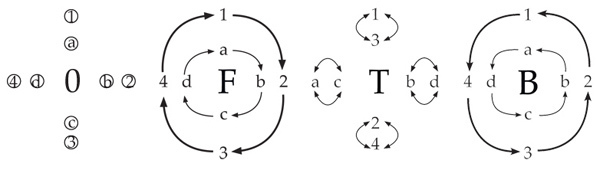 - The cyclic moves are forwards, backwards, change forwards, change backwards (F, B, CF, CB)