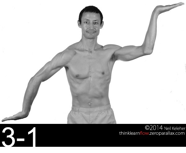 Here are the 8 positions where the right arm relates to the left via a zero move. In these positions (below) the right hand is in the same position as the left hand.