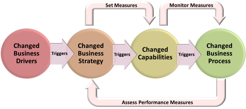In response to a change in business driver there will need to be a corresponding change in business strategy. Depending on the change this can then trigger either changes in existing business capability or potentially require the development of new ones.
