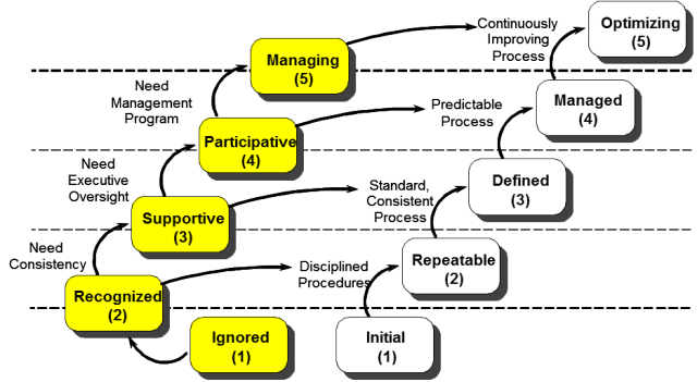 As, when progressing through the various CMMI maturity levels to achieve optimised business processes, there are parallel behavioural characteristics that must also be realised.