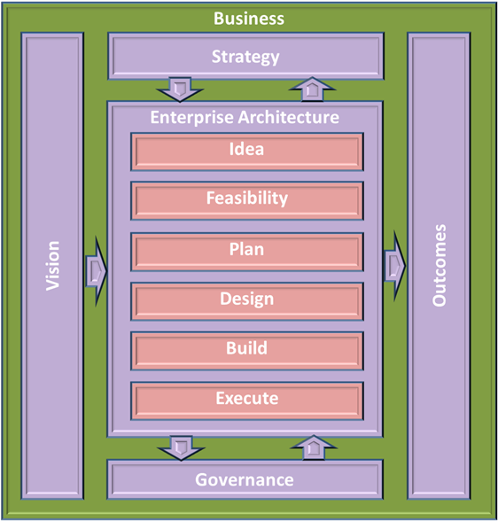 Many members of a business community with access to an Enterprise Architecture see it as an overhead that ‘gets in the way’ of them ‘doing their job. As an overhead it is seen as something apart from their ‘Business As Usual’ activities offering a distraction rather value and thus is a liability. The purpose of an Enterprise Architecture within a business is to provide a governed mechanism through which business vision and strategy is able to be translated into effective enterprise change. This is accomplished by creating, communicating and improving the key requirements, principles and models that describe the desired future state of the business and supporting the transition to that goal. Enterprise Architecture is consequently not an overhead but integral to business success. Taking an idea from initiation through to execution for example it can be seen that an Enterprise Architecture is integral to each stage in its development.