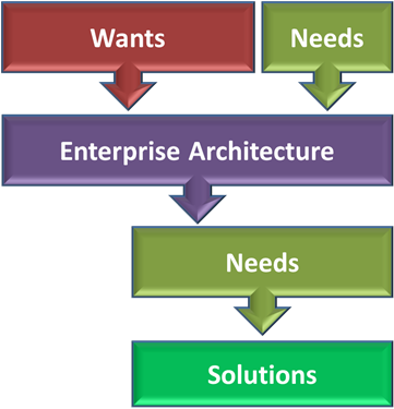 An Enterprise Architecture can provide insight into what is ‘needed’ to solve a problem and optionally allow what is ‘wanted’ but not ‘needed’ to be discarded, consequently better defining the scope of what needs to be undertaken. Focussing on the needs rather than the ‘wants’ provides for a more concise solution, delivering the benefits that are required and potentially eliminating extraneous cost and effort from the equation.