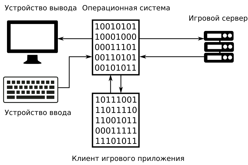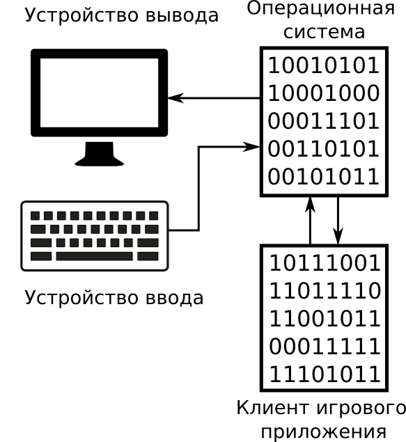 Иллюстрация 1-2 демонстрирует схему однопользовательской PC-игры. В отличие от онлайн-игры, здесь отсутствует сервер. Действия пользователя отражаются только на памяти процесса игрового приложения, в которой хранится состояние всех объектов.
