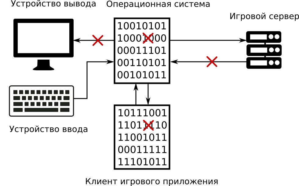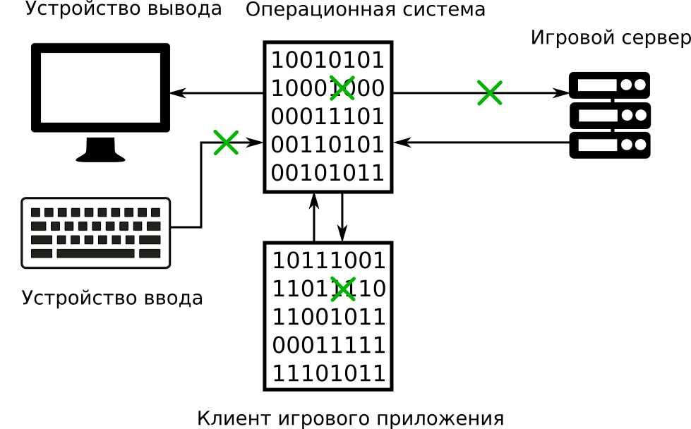 Рассмотрим ещё раз схему приложения онлайн-игры. Отметим красными крестами точки, где бот может перехватить информацию о состоянии игровых объектов. Иллюстрация 1-6 демонстрирует результат.