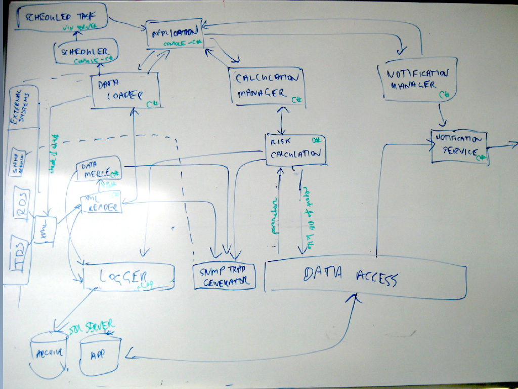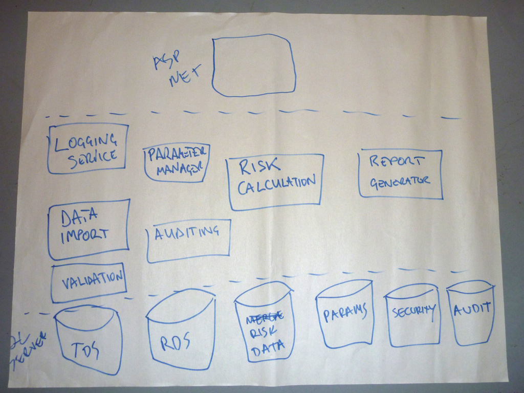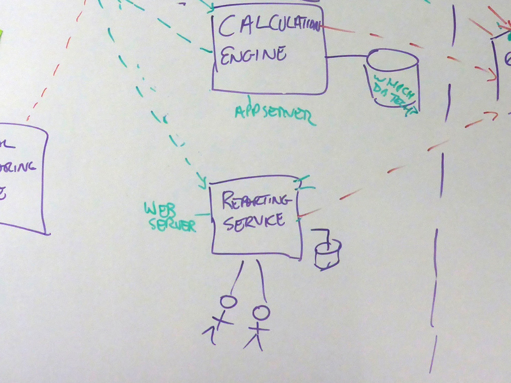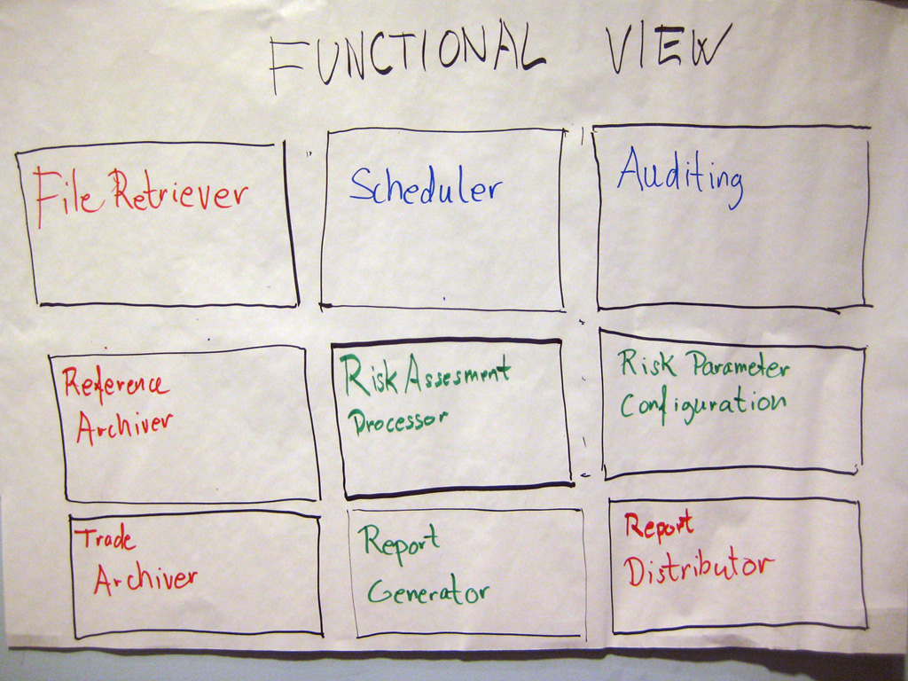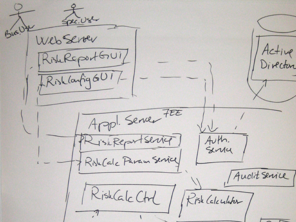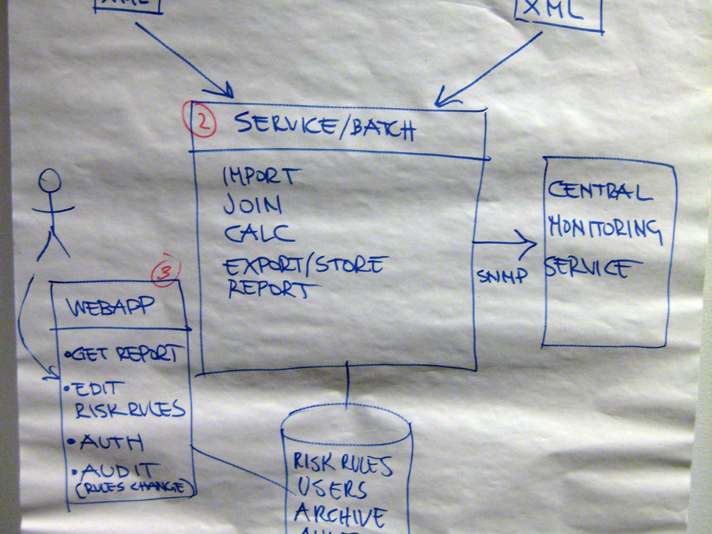 Let’s look at some examples. The small selection of photos that follow are taken from my workshops, where groups have been asked to design a small “financial risk system” for a bank, and draw one or more diagrams to communicate the software architecture of it. The purpose of the financial risk system is to import data from two data sources (a “Trade Data System”, and a “Reference Data System”), merge the datasets, perform some risk calculations, and produce a Microsoft Excel compatible report for a number of business users. A subset of those business users can additionally modify some of the parameters that are used during the calculations. You can see the full set of requirements for the financial risk system in the Appendix B.