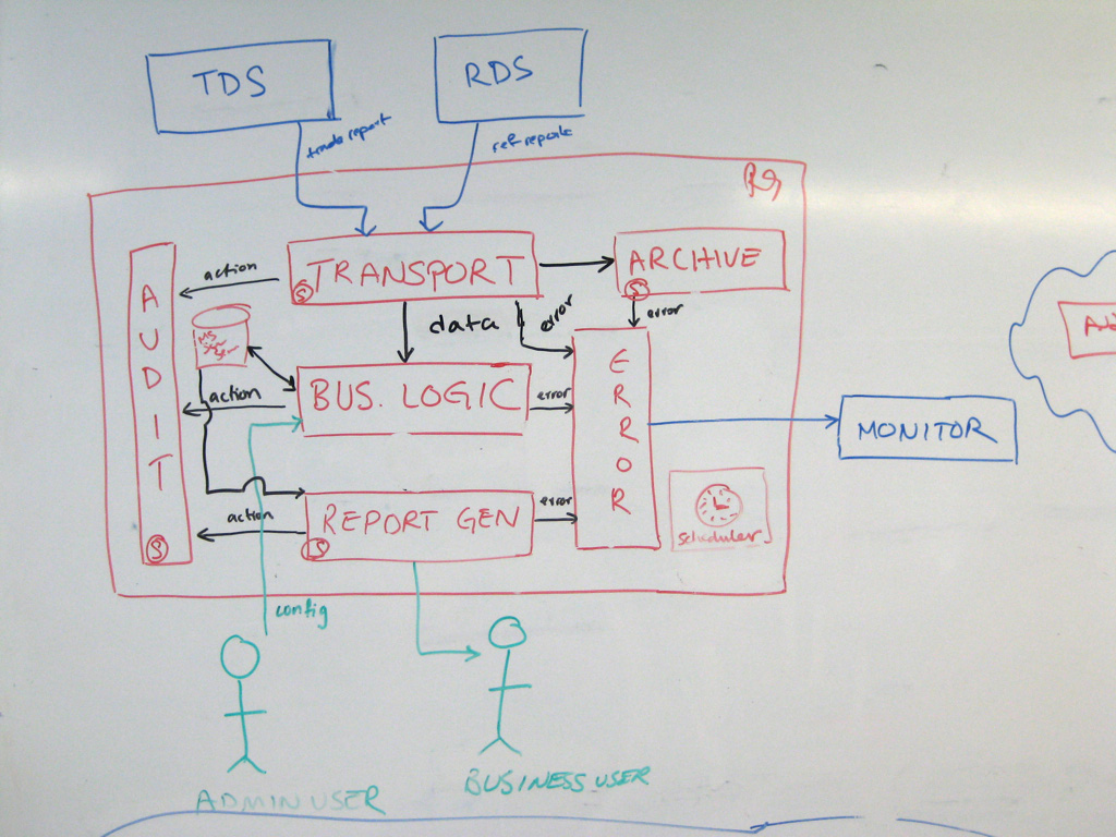 Ignoring the source data systems at the top of the diagram (TDS and RDS); we have boxes generically labelled “transport”, “archive”, “audit”, “report generation”, “error handling” and arrows labelled “error” and “action”. And look at the box in the centre - it’s labelled “business logic”, which is not hugely descriptive! Most of the content is very generic. This diagram doesn’t tell you much about the business domain at all.