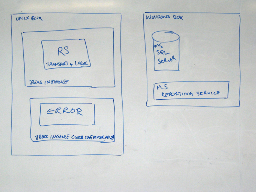 There’s a Unix box and a Windows box, with some additional product selections that include JBoss (a Java EE application server) and Microsoft SQL Server. The problem is, I don’t know what those products are doing, plus there seems to be a connection missing between the Unix box and the Windows box. It’s essentially a bulleted list of technologies that’s been presented as a diagram.