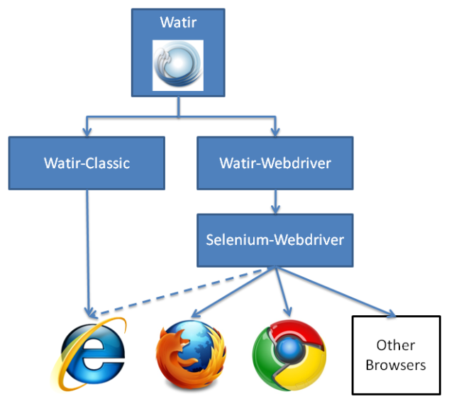 - Watir-Webdriver - This gem allows the driving of additional browsers - eg Chrome and Firefox. It is an API wrapper around the Selenium-Webdriver gem (ie translates the Watir commands to Selenium-Webdriver commands).