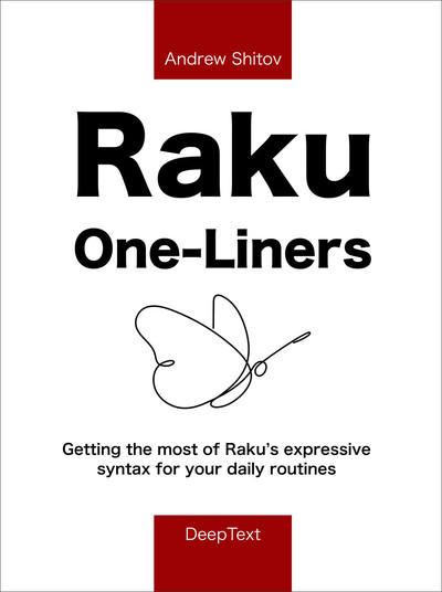 Published BooksA Language a DayAndrew ShitovA Tour of Python 3Andrew ShitovRaku One-LinersAndrew ShitovUsing RakuAndrew ShitovPerl 6 at a GlanceAndrew Shitov