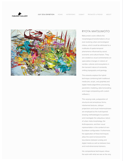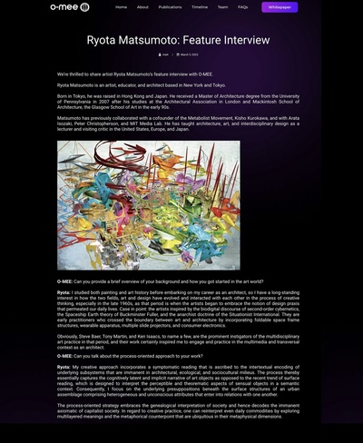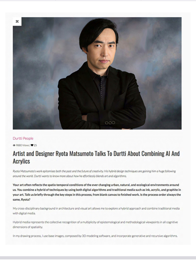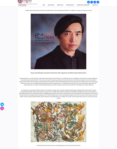 Published Books松本良多 インタビュー | ArtUp Mi 2023Richard Takis松本良多 インタビュー - Jung Katz 3月 2016Richard Takisインタヴュー 松本良多 | Mass Magazine ファッション & アート 2016Richard Takis松本良多 - インタビュー / トルコ現代建築と美術 | TraMod アカデミー 2023Richard Takisインタビュー 松本良多 Made in Mind マガジン 2015Richard Takis松本良多 / アクリルとAIの融合 - Durtti 2017Richard Takis松本良多 - アートと建築 | Faburry Gallery 2016Richard Takis松本良多 / アクリルとAIの融合 - Durtti 2017Richard Takis特集 / インタビュー 松本良多 – O-MEE 2023Richard Takis松本良多 インタビュー | クリエイティブペーパー - 2016-2020Richard TakisCreativPaper / Ryota Matsumoto: New Media Art, Architecture, and Urbanism - 2016-2020Richard TakisRyota Matsumoto: Feature Interview – O-MEE | March 2023Richard TakisVisionary Architects Ryota Matsumoto and Perry Kulper | Canny Communication in Architecture in the Age of Messy Media - Helen CastleRichard TakisRyota Matsumoto - Rapid Gaze Polynomials Embedded in Infinite Variables | ArtAscent Art & Literature JournalRichard TakisRyota Matsumoto and Perry Kulper - Canny Communication in Architecture in the Age of Messy Media by Helen CastleHelen CastleInterview with the Founder of Postdigital Culture: Ryota Matsumoto | ArtUp Mi SPRING 2023Richard TakisAn Interview with Architect: Ryota Matsumoto - Art, Architecture, and Technology | Culture in KentRichard Takis