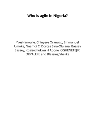 Published BooksWho is agile in Nigeria?YvesHanoulle, LEARNTOR, Chinyere Oranugo, Emmanuel Umoke, Nnamdi C, Dorcas Sina-Olulana, Bassey Bassey, Kosisochukwu H Abone, OGHENETEJIRI OKPALEFE, and Blessing Shelika
