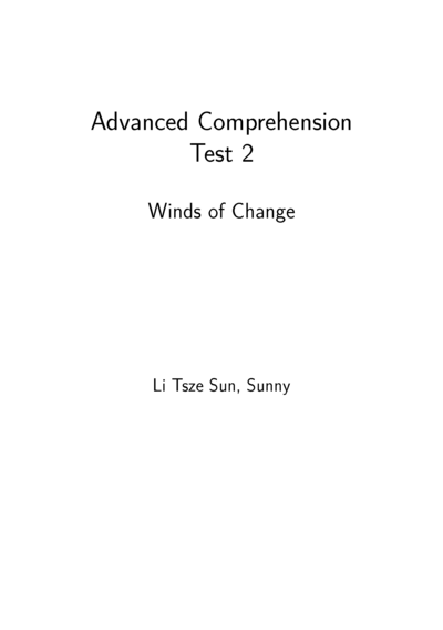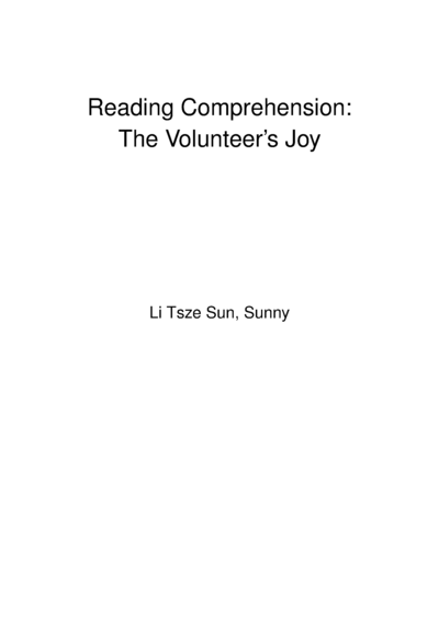 Published BooksAdvanced Comprehension Test 2Li Tsze Sun, SunnyCreative Writing TopicsLi Tsze Sun, SunnyReading Comprehension: The Volunteer's JoyLi Tsze Sun, Sunny