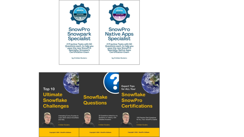 Top 10 Ultimate Snowflake Challenges is an exciting collection of hidden hands-on gems for Snowflake, presented in an original manner. The live interactive version of this book has been implemented as an Udemy video course as well.